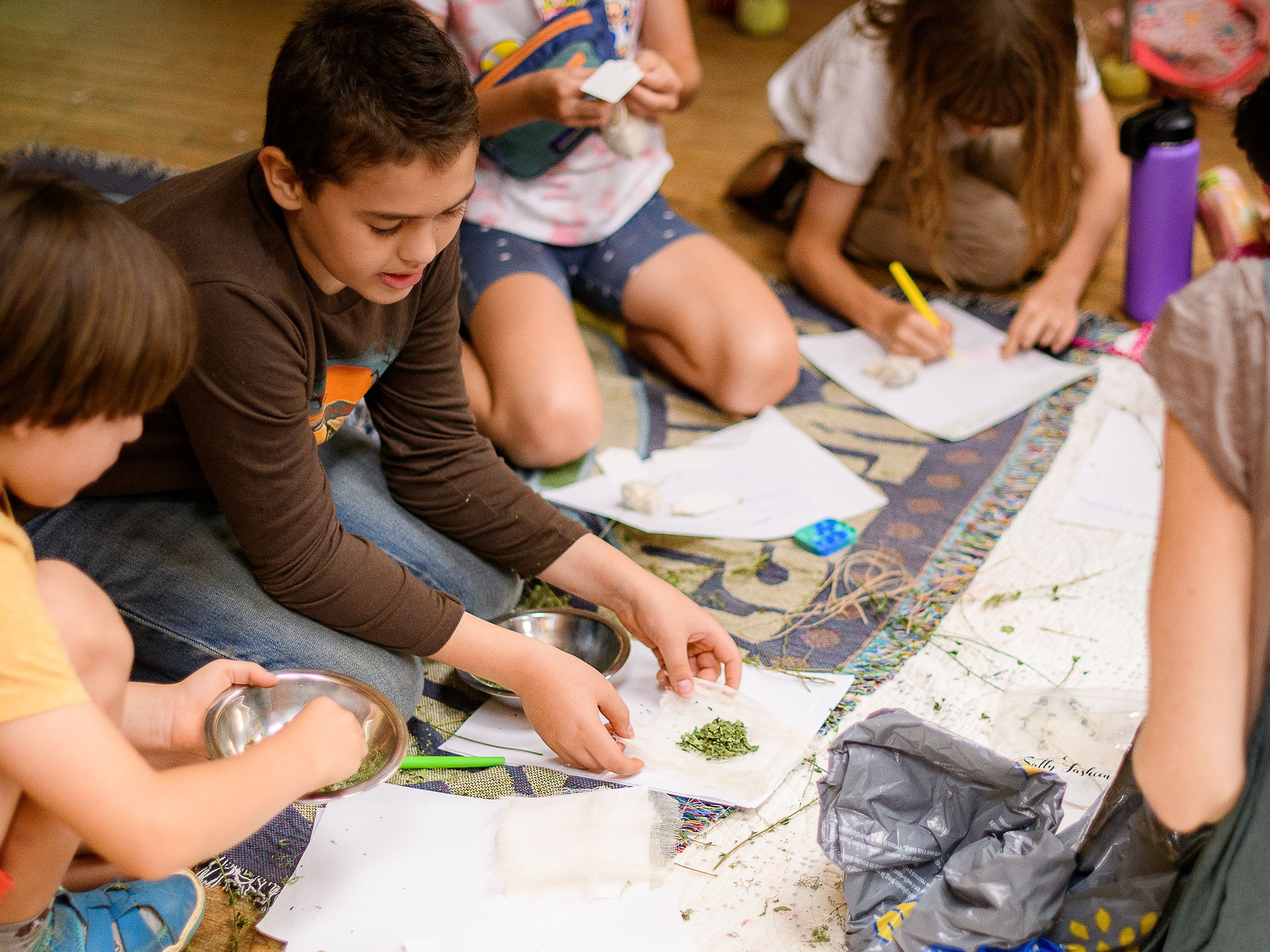 In Week One, Elderwoods campers engage deeply with the theme of Earth through mindful exploration and hands-on craft. In Nature Journaling & Hiking, students make and bind their own nature journals before heading out on local walks and hikes to observe the living landscape and record their experiences through writing, drawing, and reflection. In Plant-Based Crafts campers use plant materials and water baths to naturally dye wool or fabric, observing how color slowly deepens and changes over time.